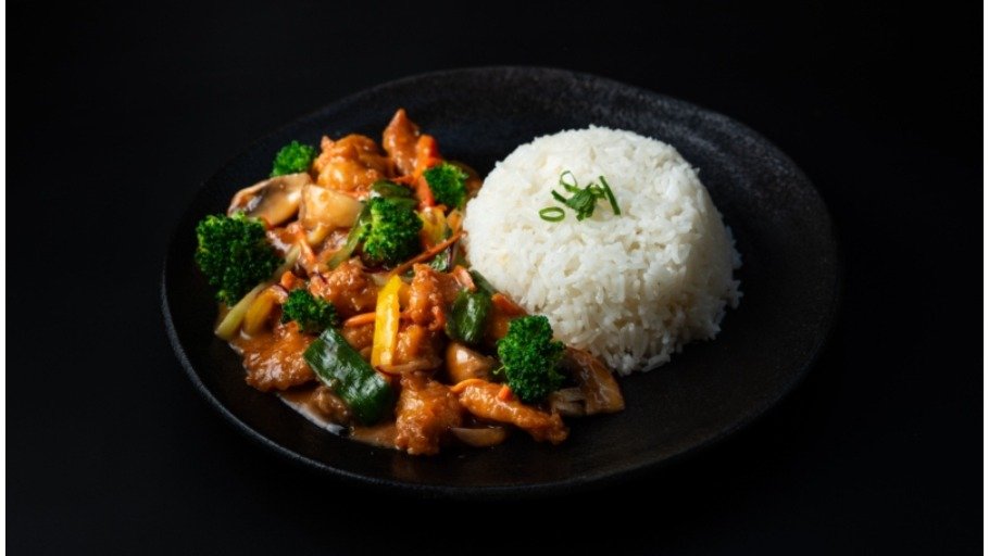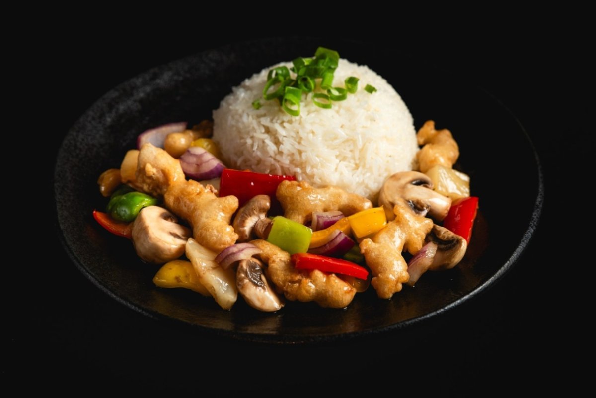 כדורי עוף בטמפורה מוקפצים ברוטב חמוץ מתוק עם פטריות שמפיניון, פלפלים, בצל סגול, אננס ובוטנים. מוגש עם אורז מאודה