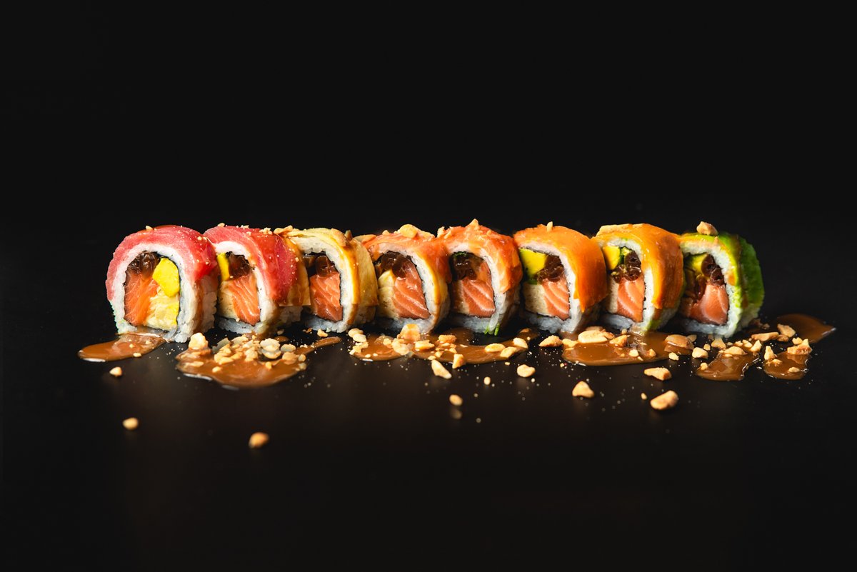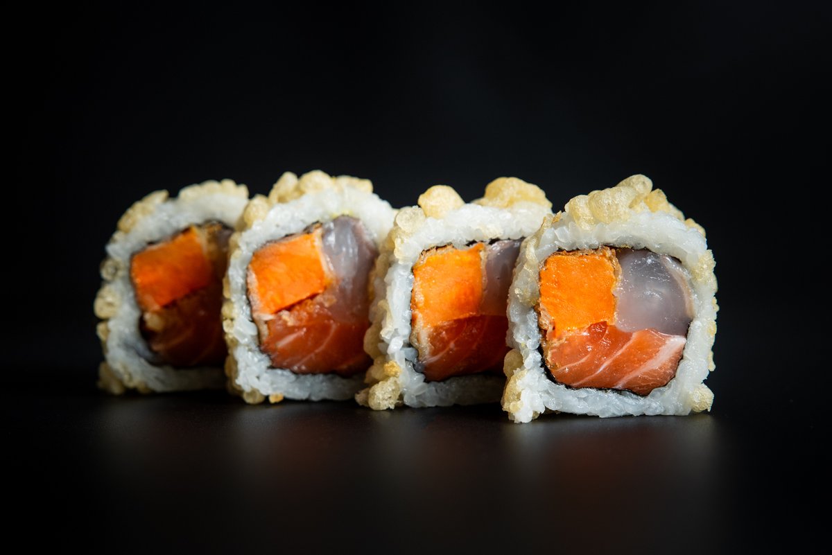ספייסי סלמון/סלמון טמפורה (לבחירה), אבוקדו ובטטה בציפוי סלמון צרוב, שבבי בטטה, פנקו ובצל ירוק. הספייסי סלמון מכיל שומשום.