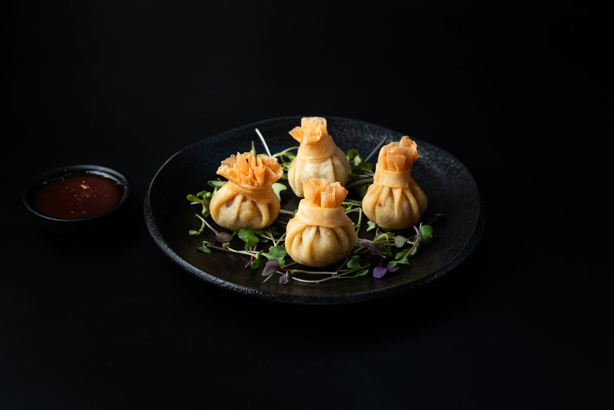 חמישה כיסונים במילוי בטטה. מוגש עם רוטב סויה וג׳ינג׳ר בצד --מכיל שומשום--