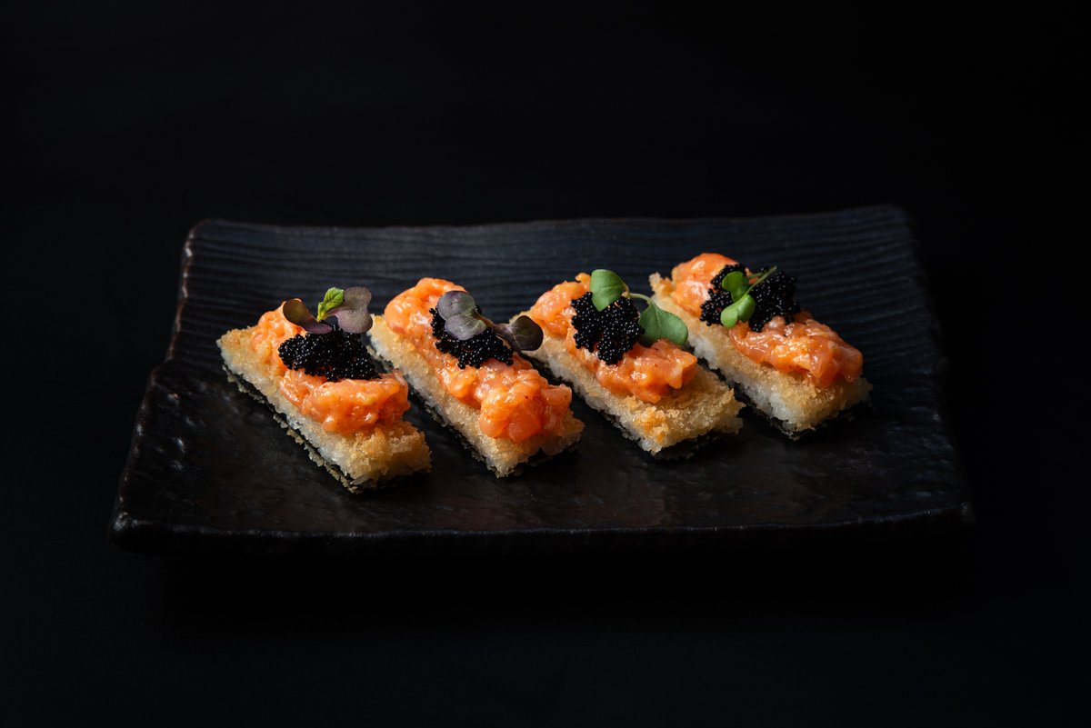 4 יחידות של אצה ואורז מטוגנים בפנקו, מוגשים עם ספייסי סלמון, רוטב צ'ילי חריף, טוביקו שחור בקישוט עלי מיקרו. מכיל גלוטן (אלרגן - שומשום)
