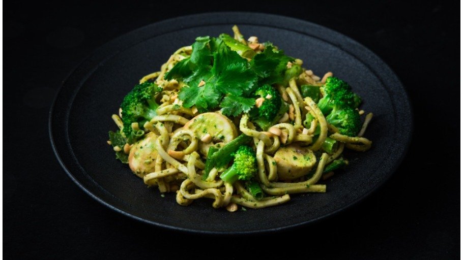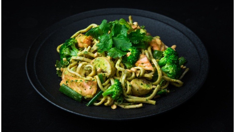 נתחי עוף בטמפורה מוקפצים ברוטב פיקנטי עם חלב קוקוס, צ'ילי ותמרינדי, גזר, ברוקולי, בצל סגול, פלפל אדום, קולורבי, בצל ירוק, עלי תרד ופטריות. מוגש עם אורז מאודה. מכיל גלוטן