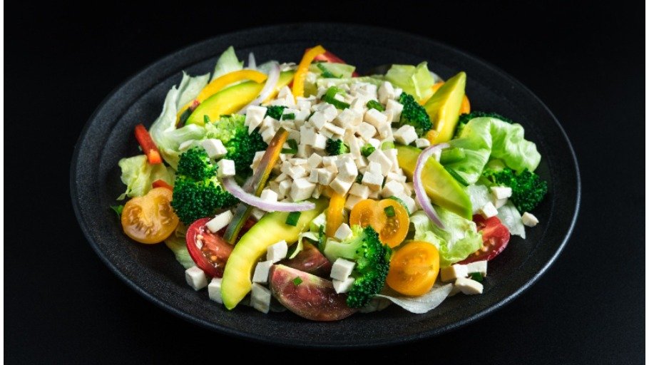 חסה, עגבניות שרי ובצל סגול ברוטב ויניגרט אסיאתי. אין אלרגנים במנה