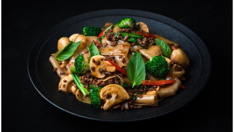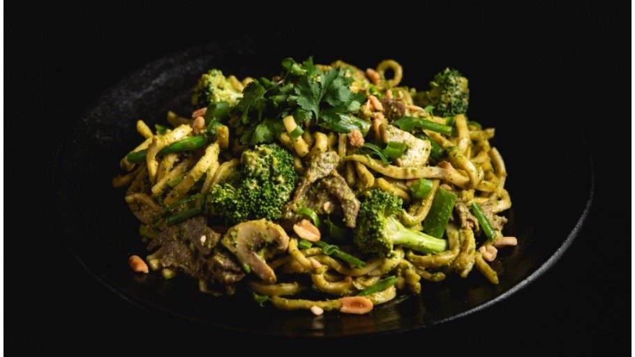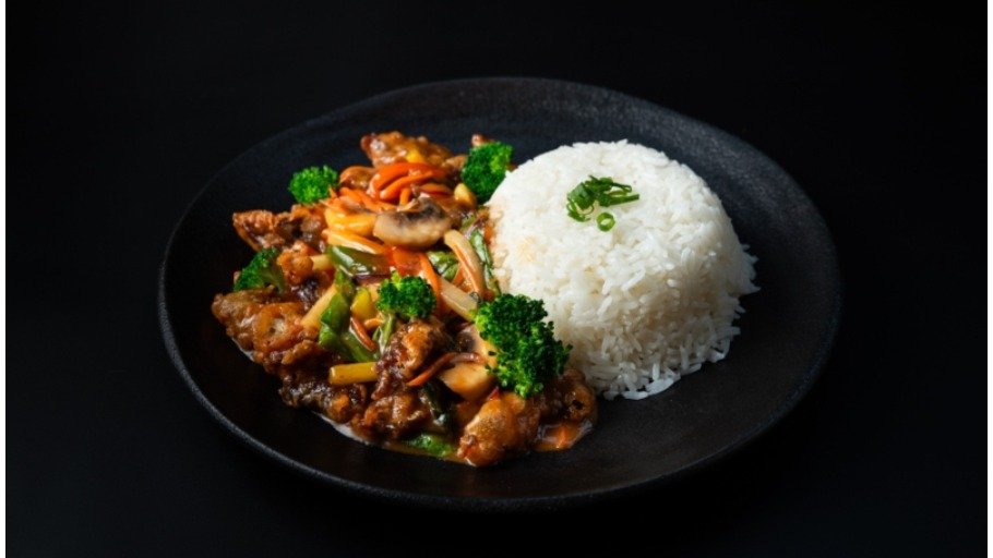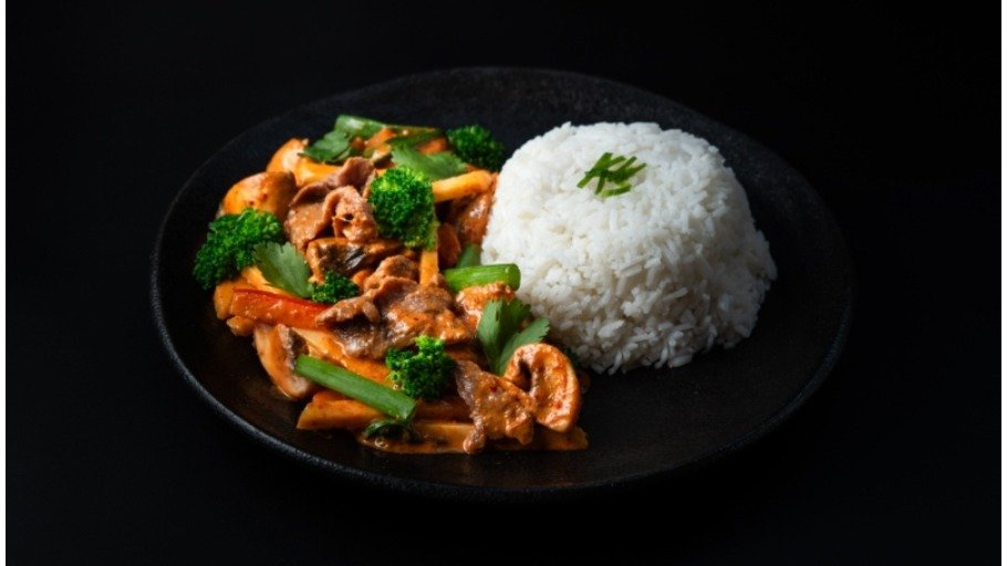 נתחי בקר מוקפצים בקארי אדום וחלב קוקוס עם ברוקולי, קולורבי, פטריות שמפניון, פלפלים, בצל ירוק ובזיליקום. מוגש עם אורז מאודה. מכיל גלוטן