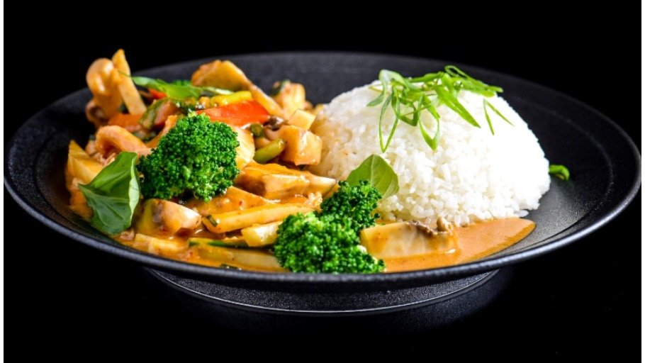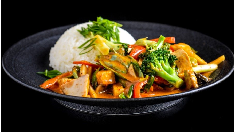 טופו מוקפץ בקארי אדום וחלב קוקוס עם ברוקולי, קולורבי, פטריות שמפניון, פלפלים בצל ירוק ובזיליקום. מוגש עם אורז מאודה.