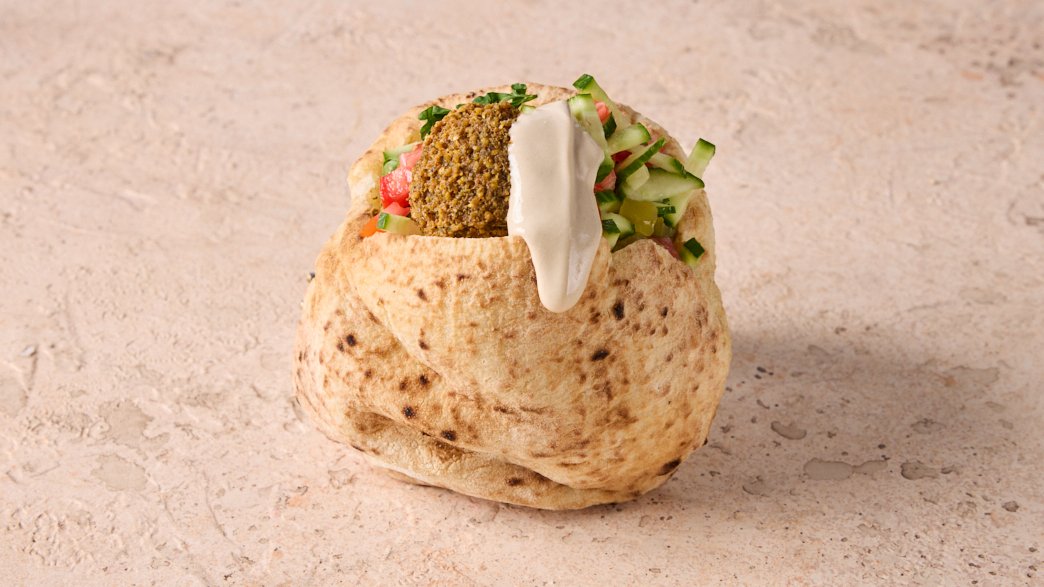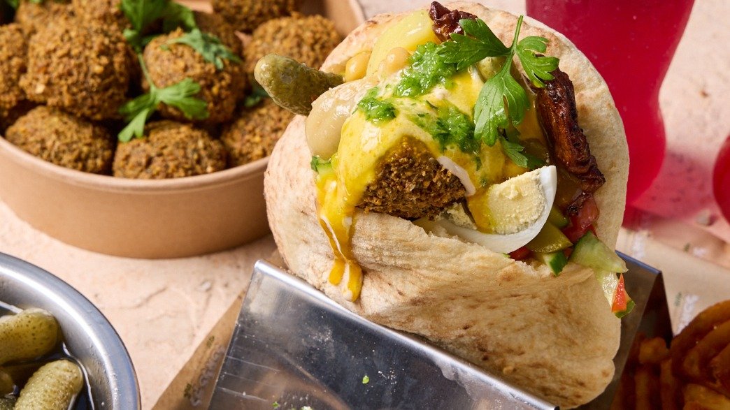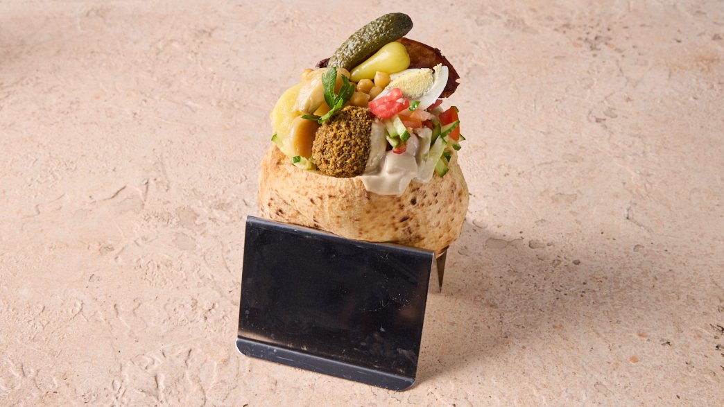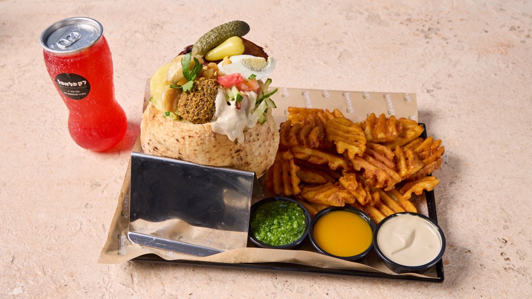 Falafel done right – hot, crispy, and satisfying, with fresh salads, generous spreads, and toppings like eggplant, chickpeas, and potatoes. From the classic pita to the full combo with waffle fries and nostalgic Israeli soda Kosher L'mehadrin