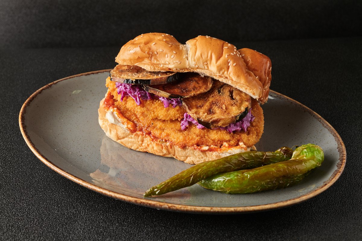 שניצל עם חומוס, חריף, מטבוחה, חציל, כרוב לבן, מלפפון חמוץ וטחינה