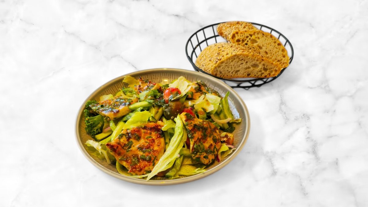 חזה עוף בעשבי תיבול, חסה, שרי צבעוני, בצל סגול ומלפפון עם ויניגרט הבית מוגש עם לחם לבחירה