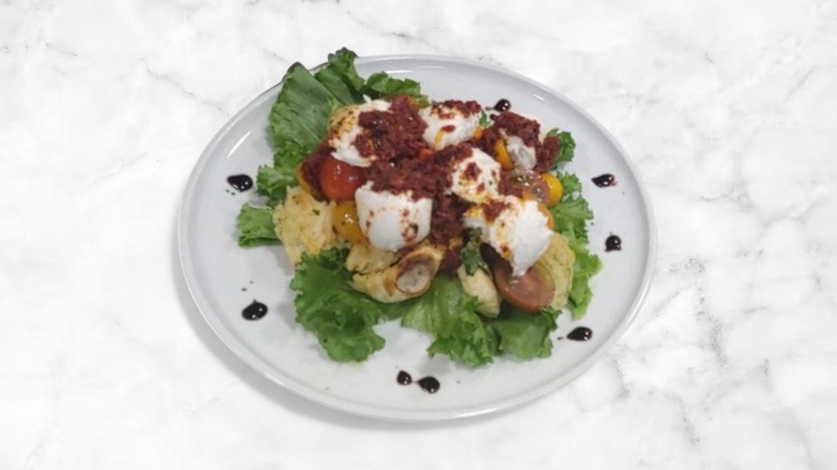 קרעי מוצרלה עם ממרח עגבניות מיובשות, קרעי פוקצ'ה, שרי צבעוני, עלי בזיליקום טרי, עלי אורגנו וחסה עם בלסמי מצומצם שמן זית
