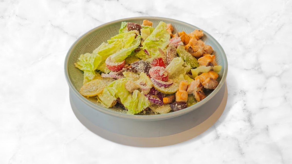 קוביות סלמון, לבבות חסה רומית, קרוטונים, שרי צבעוני, בצל סגול, פרמז׳ן ורוטב קיסר (חלבי) מוגש עם לחם לבחירה