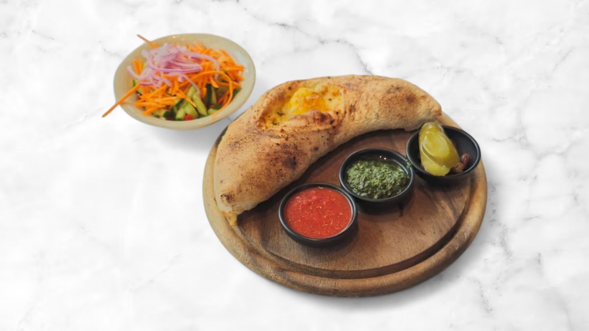 מאפה בצק במילוי גבינות וביצת עין מ וגש עם סלסת עגבניות, פסטו וחמוצי הבית
