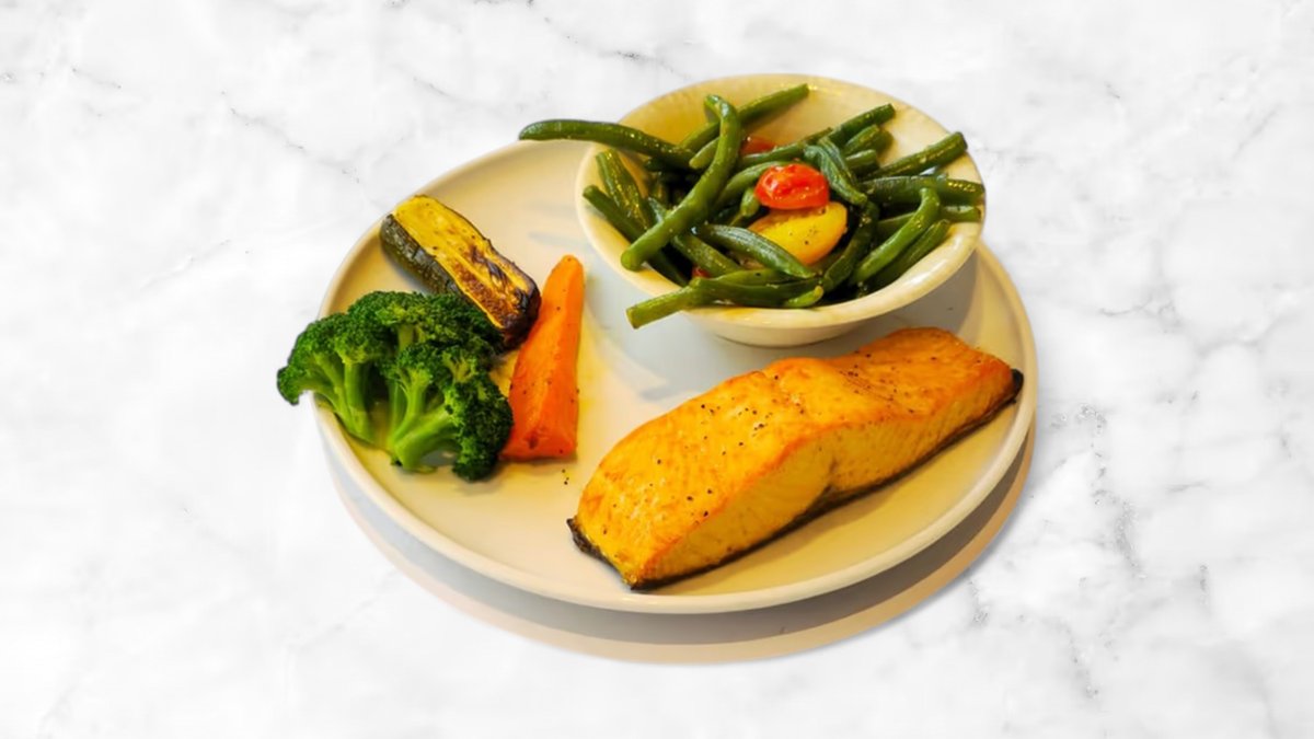 פילה סלמון אפוי בתנור עם שמן זית, שום מלח ופלפל מוגש עם תוספת לבחירה