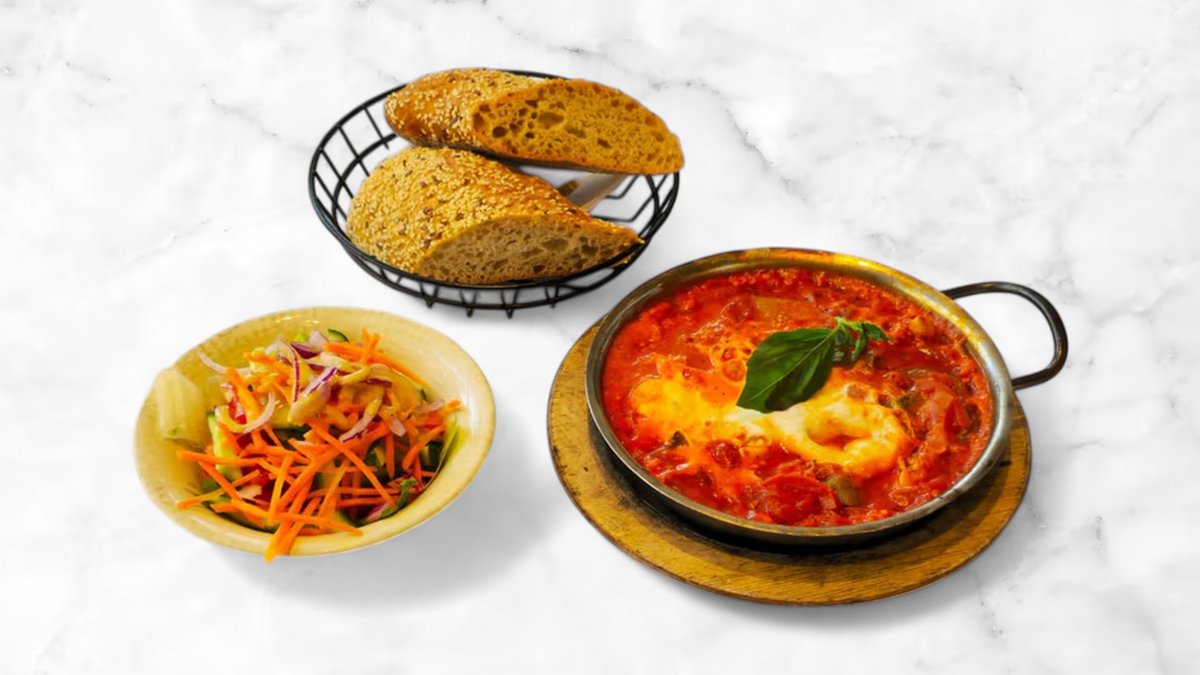 תבשיל עגבניות עם ביצים, פטה, פלפלים קלויים ועלי בזיליקום מוגש עם לחם הבית וטחינה