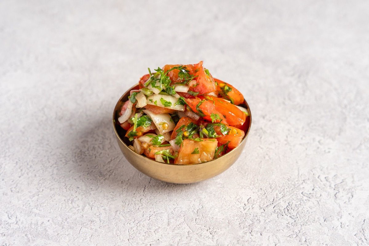 מלפפון, עגבנייה, בצל, עלים, בתיבול שמן זית ולימון