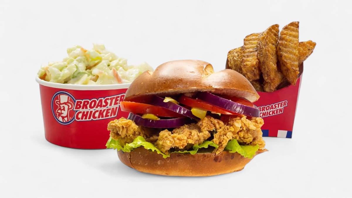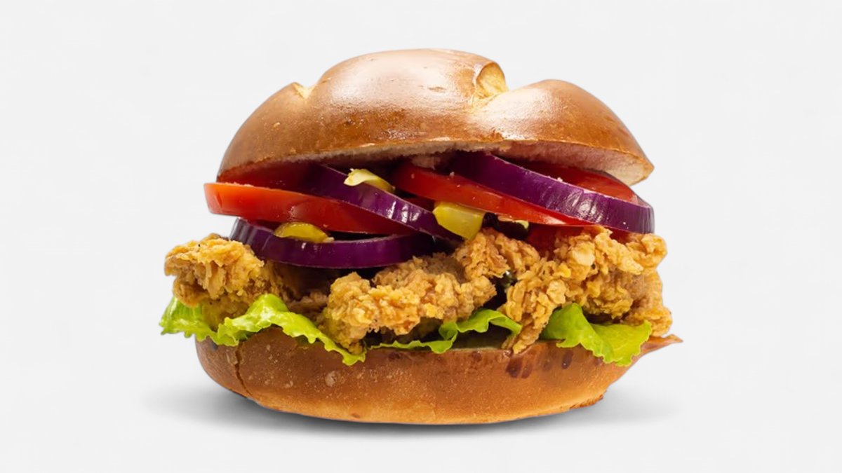 קריספי צ׳יקן בלחמניה, רוטב אלף האיים, חסה, בצל סגול, מלפפון חמוץ ועגבנייה + תוספת לבחירה