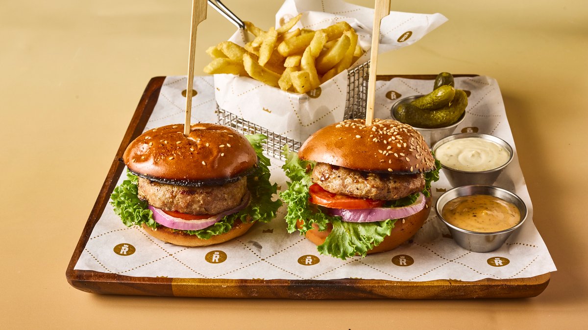 המבורגר טונה אדומה, צמד לחמניות סליידר, ספייסי מיו, חסה, בצל, עגבנייה וקורנישונים מוגש עם צ׳יפס