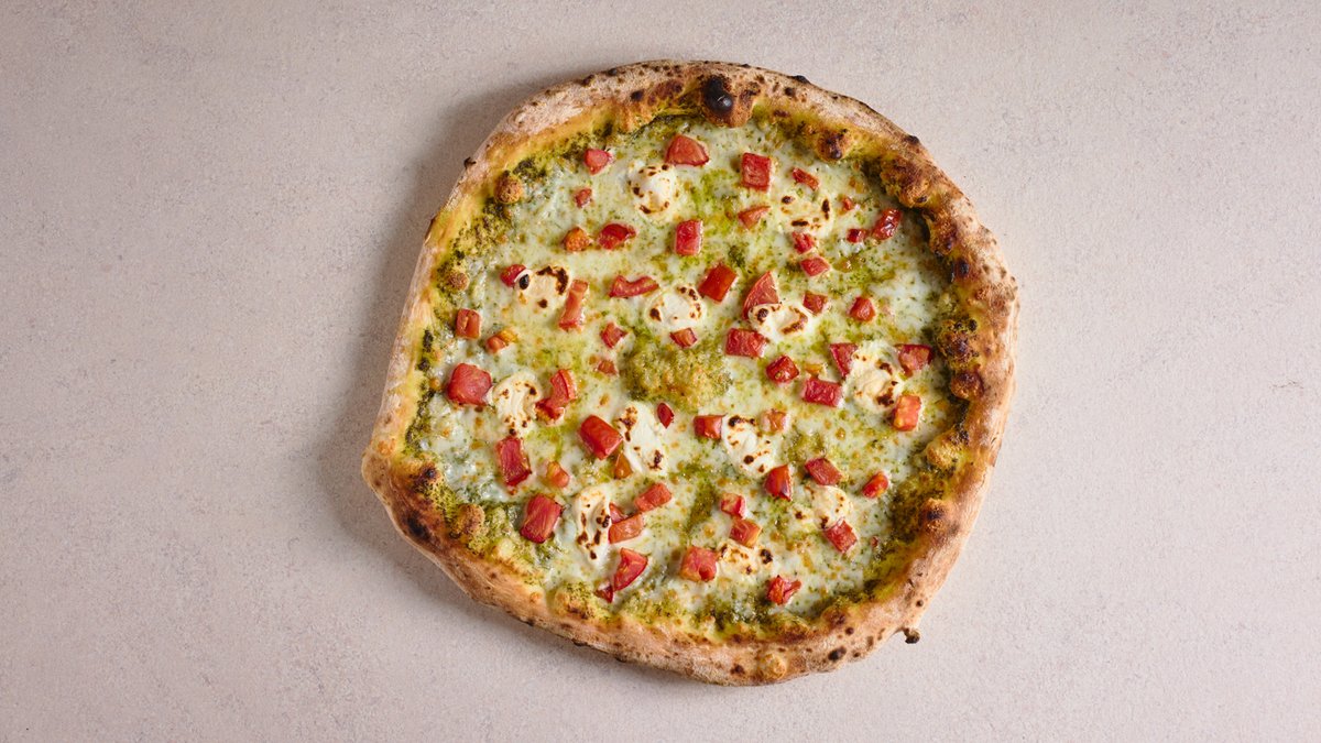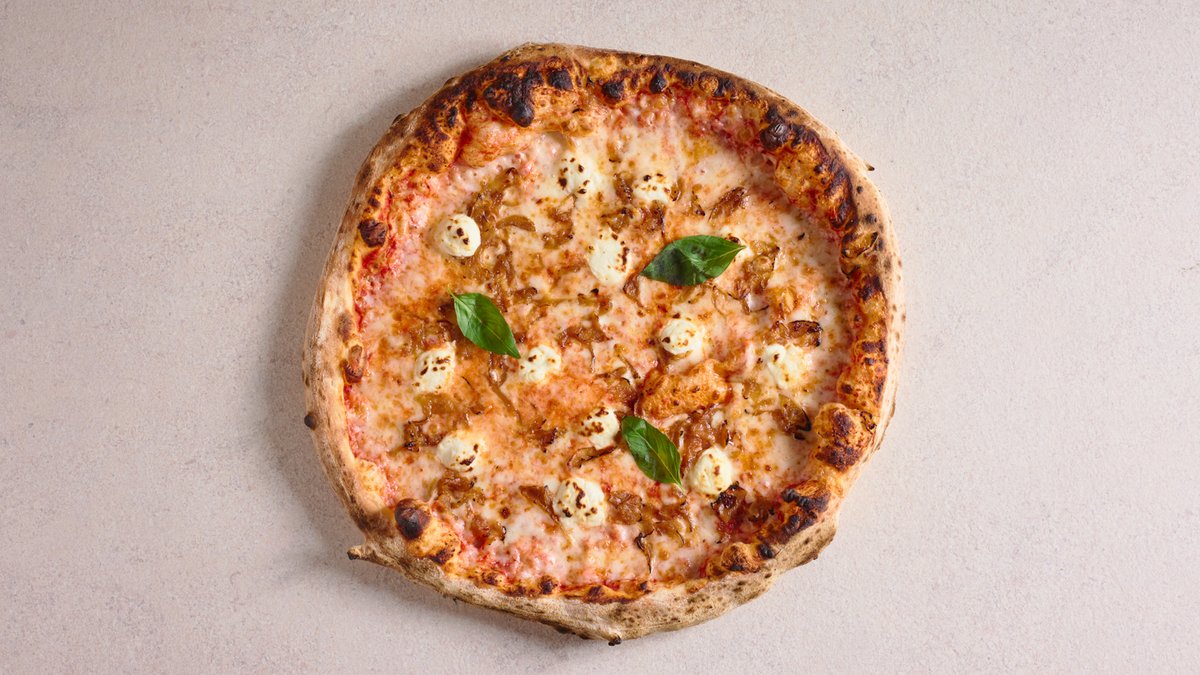 רוטב עגבניות, עלי בזיליקום, מוצרלה טרייה, גבינת עיזים, בצל מקורמל ודבש חם