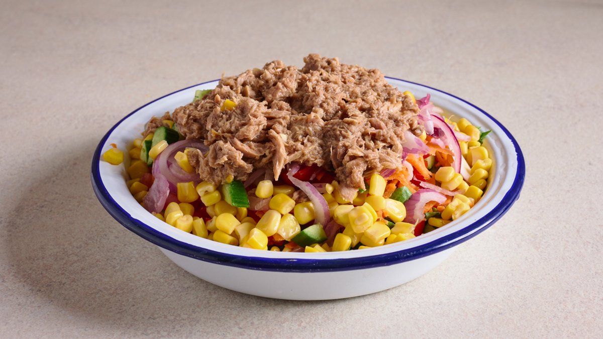 חסה, מלפפון, עגבנייה, פלפל אדום, גזר, בצל אדום, תירס וטונה
