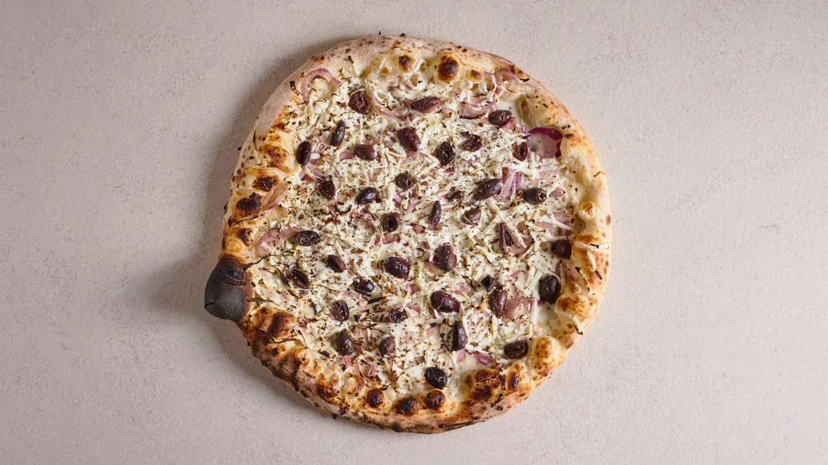 קרם שמנת, עלי בזיליקום, מוצרלה טרייה, בצל סגול, גבינה בולגרית, זיתי קלמטה ואורגנו
