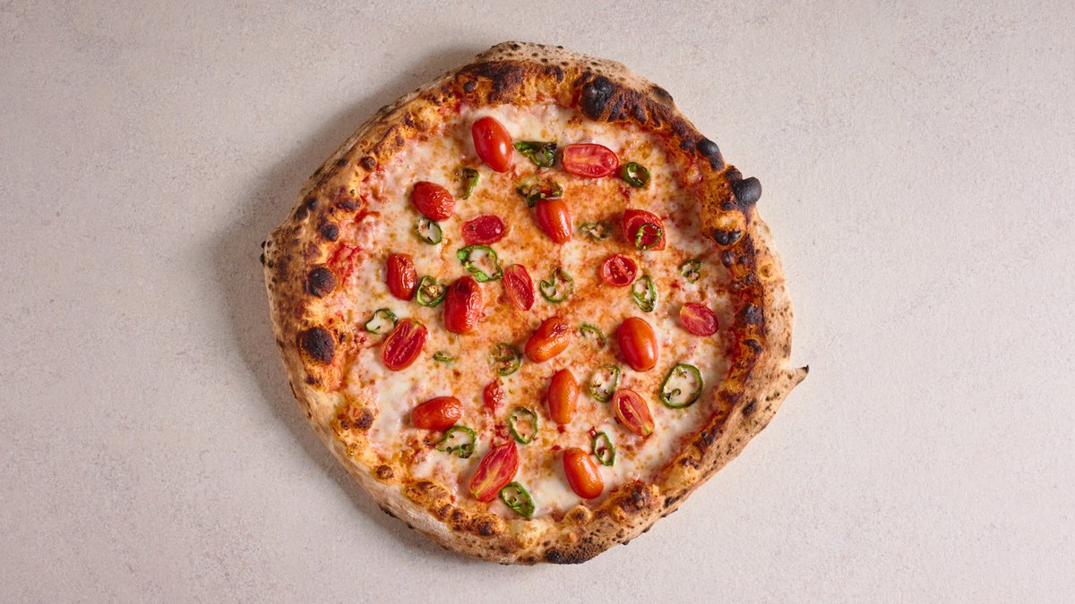 רוטב עגבניות, עלי בזיליקום, מוצרלה טרייה, עגבניות ופלפל חריף