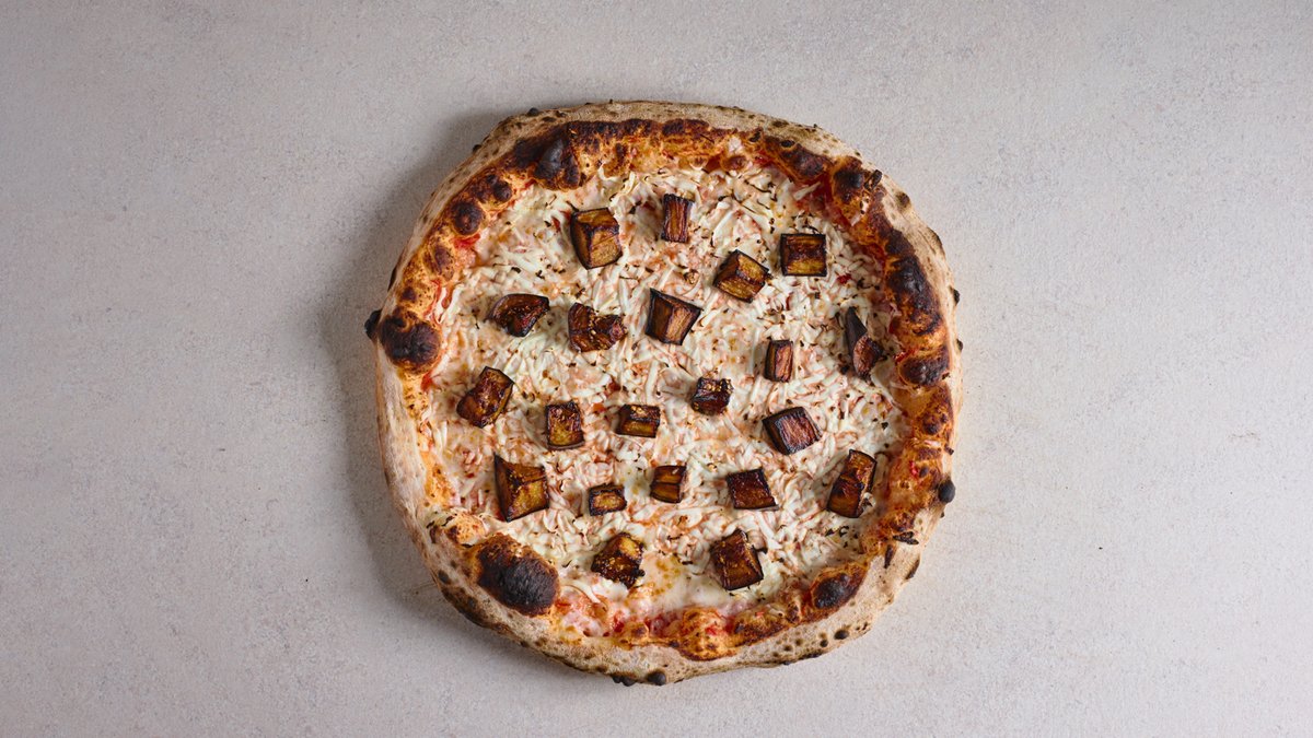 רוטב עגבניות, עלי בזיליקום, מוצרלה טרייה, פרוסות חציל קלוי, גבינה בולגרית