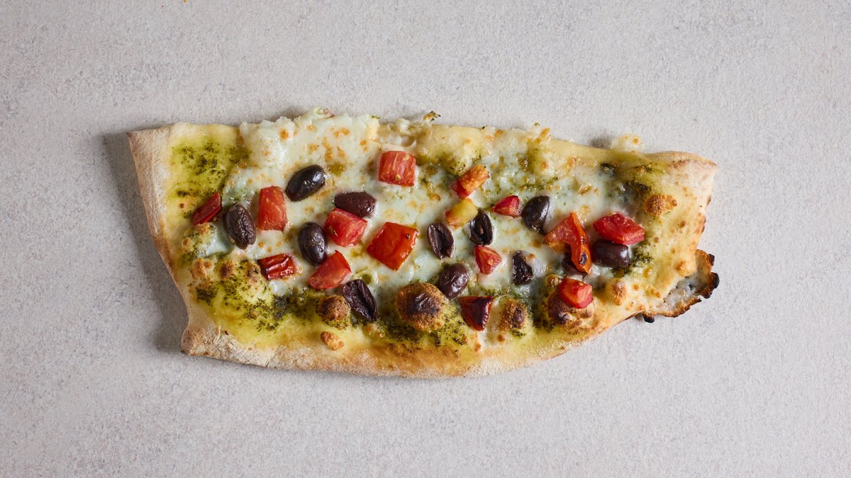 ממרח פסטו, עגבנייה, מוצרלה טרייה, וזיתי קלמטה