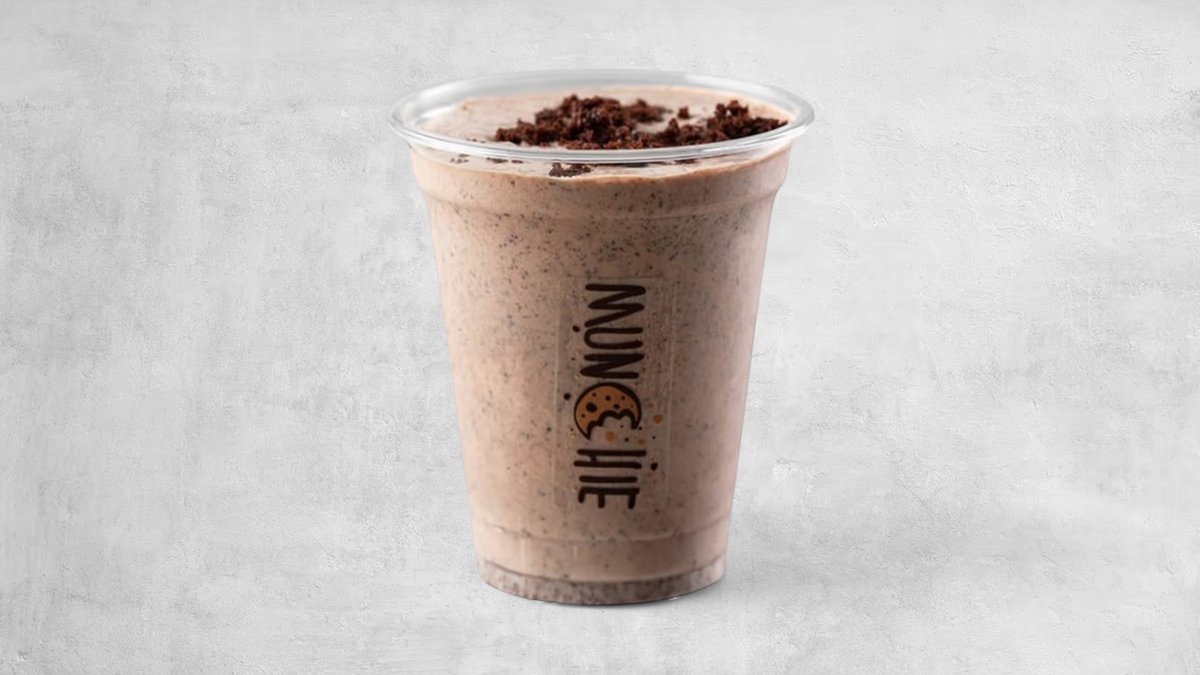 מילקשייק על בסיס קקאו, גלידה רכה בטעם וניל, שברי עוגיית שוקו שוק, חלב ואבקת קקאו