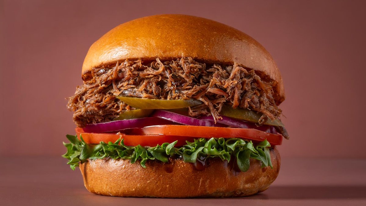 בשר מפורק בבישול ארוך עם חסה, עגבניה, חמוצים, בצל ורטבים לבחירה