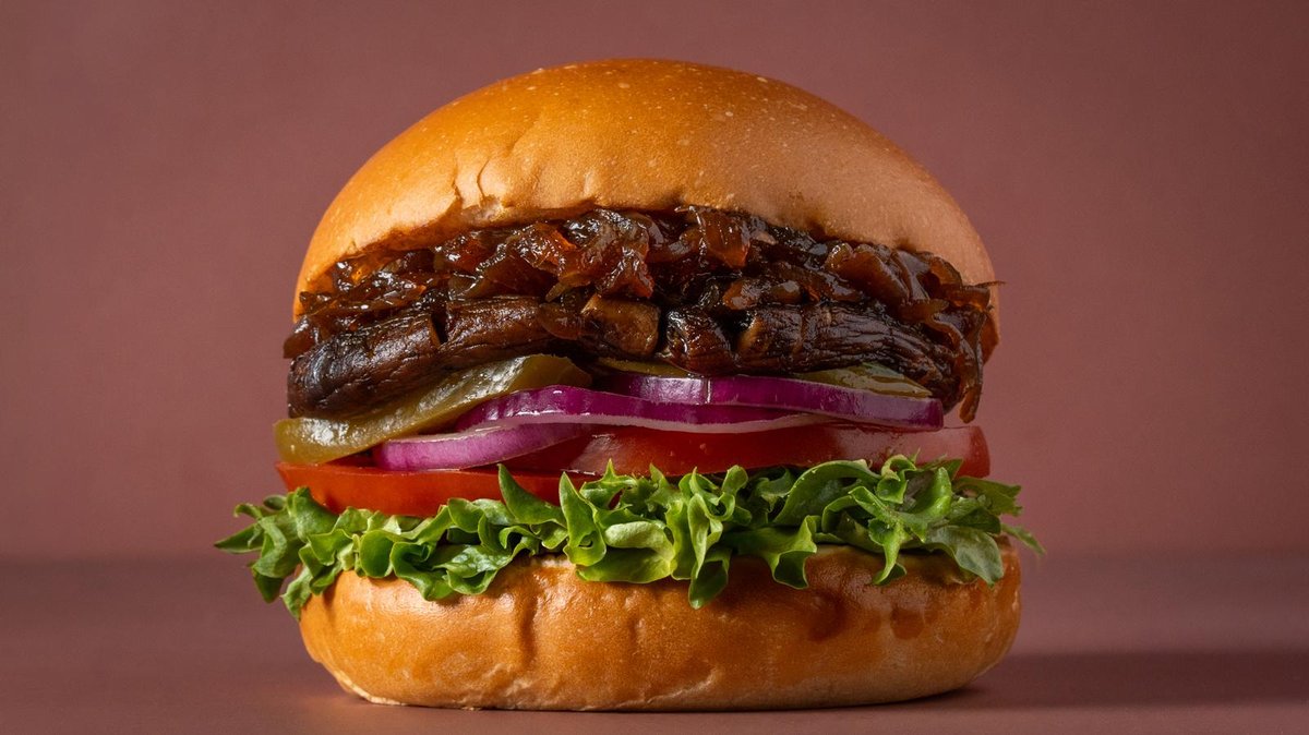 פטריית פורטובלו עם ריבת בצל, חסה, עגבניה, חמוצים, בצל ורטבים לבחירה