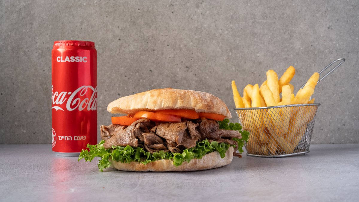 רצועות אנטריקוט בלחם פרנה מרוקאי/קסטן חם עם ירקות, רטבים, תוספת ושתייה לבחירה