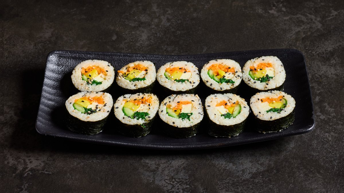 גליל אצות קוריאני ממולא באורז מתובל בשמן שומשום, חביתה בסגנון קוריאני, מלפפון, גזר, תרד וצנון קוריאני מתוק כבוש