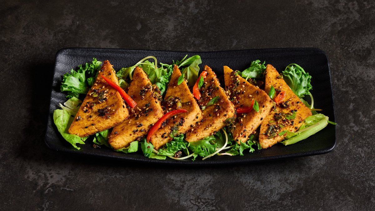 טופו כבוש חריף ברוטב הבית שלנו, מוגש עם פטריות מוקפצות, בצל ופלפלים, מוגש על עלים טריים