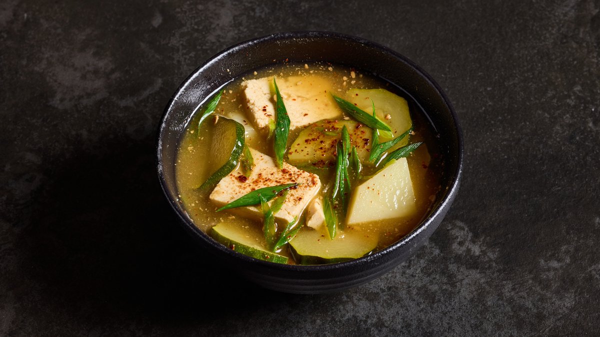 דּוּאַנְגָ'נְג מִיסּוֹ, טופו, תפוחי אדמה, קישואים ובצל ירוק מורתחים בציר דגים טרי