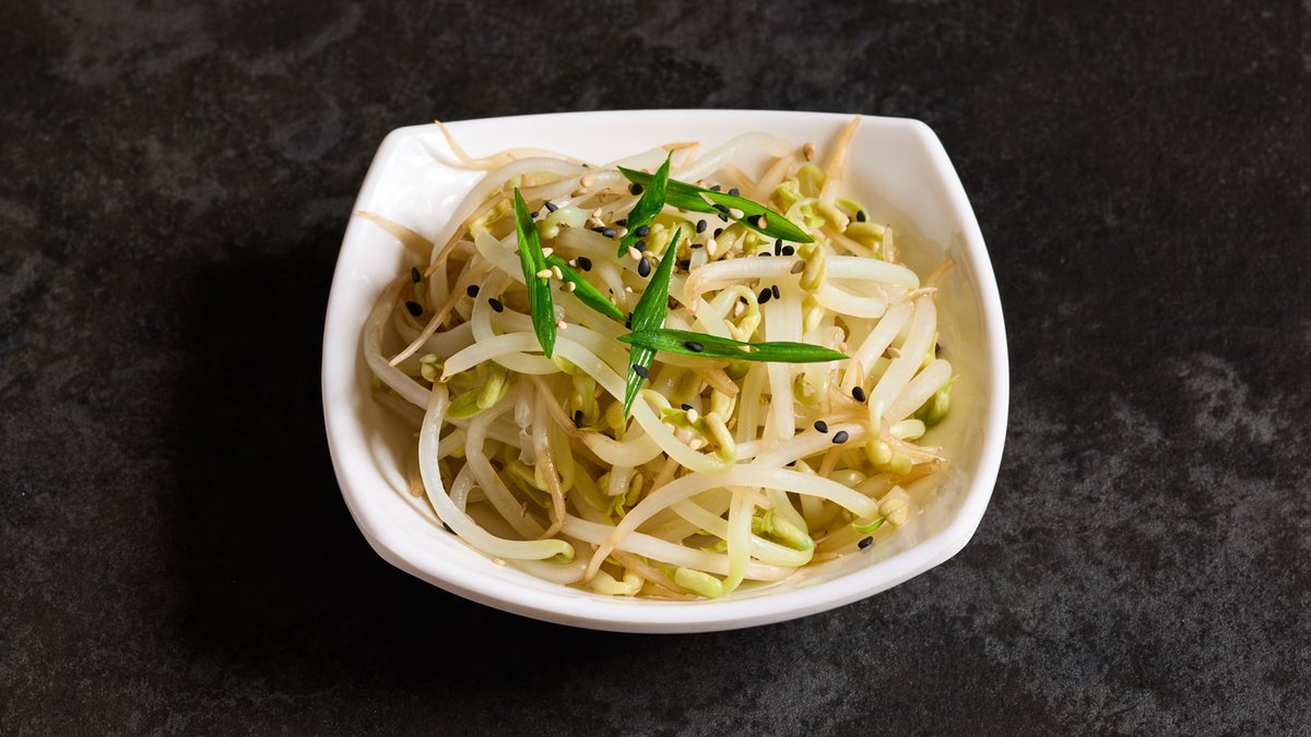 נבטי שעועית רעננים מתובלים בשום טרי, שמן שומשום ורוטב סויה