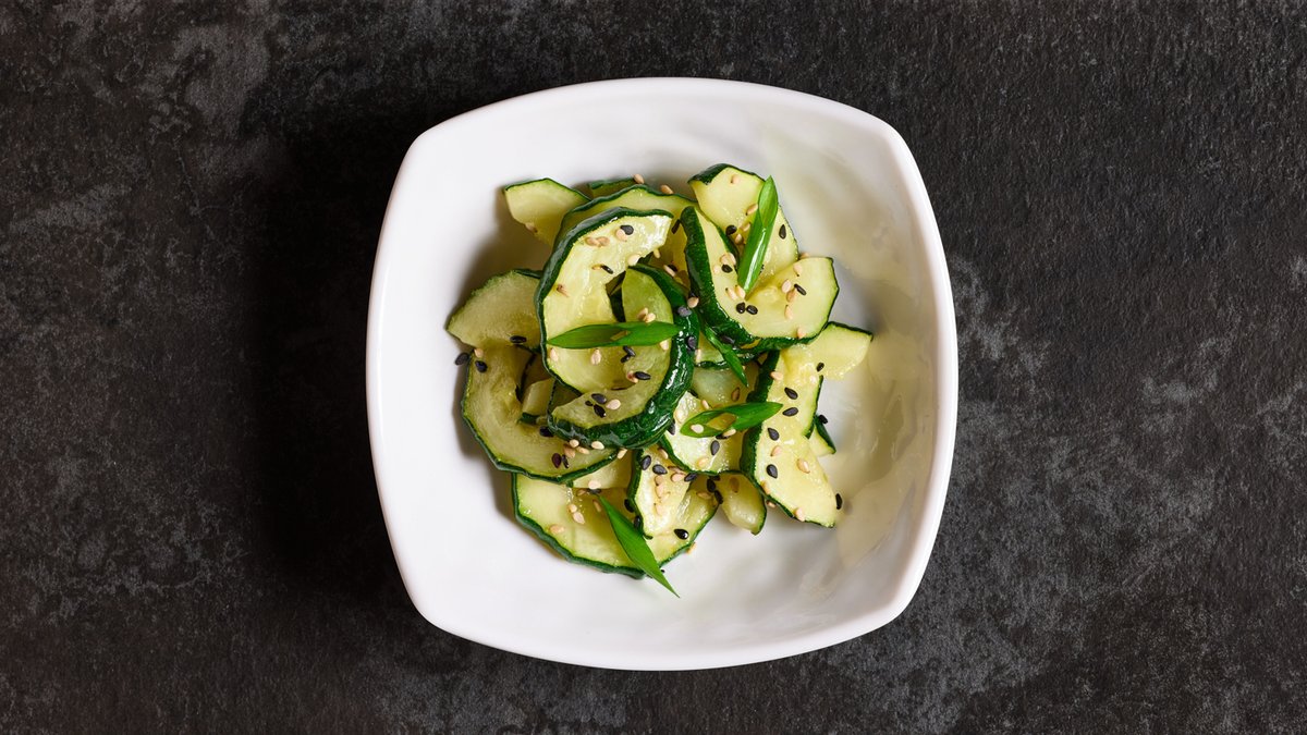 זוקיני פרוס מתובל בשום טרי, שמן שומשום ורוטב סויה
