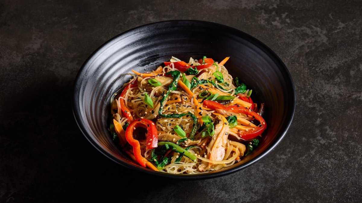אטריות זכוכית קוריאניות ומבחר ירקות מוקפצים בשמן שומשום ורוטב צָ'אפְּצֶ'ה