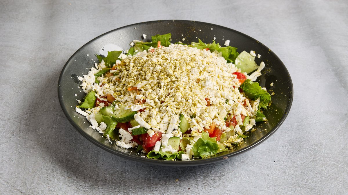 חסה, מלפפון, עגבניה, בצל, פטריות, זיתים שחורים, זיתים ירוקים, פלפל חריף, גבינה בולגרית, שמן זית, מלח, פלפל ומיץ לימון