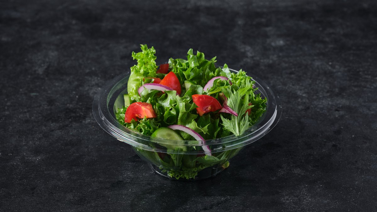 חסה, מלפפון, עגבניות שרי ובצל סגול, עם רוטב שום וחרדל בדבש