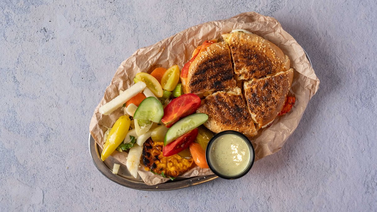בולגרית, עלי בייבי , רוטב הבית, מלפפון חמוץ וסלט קטן בצד