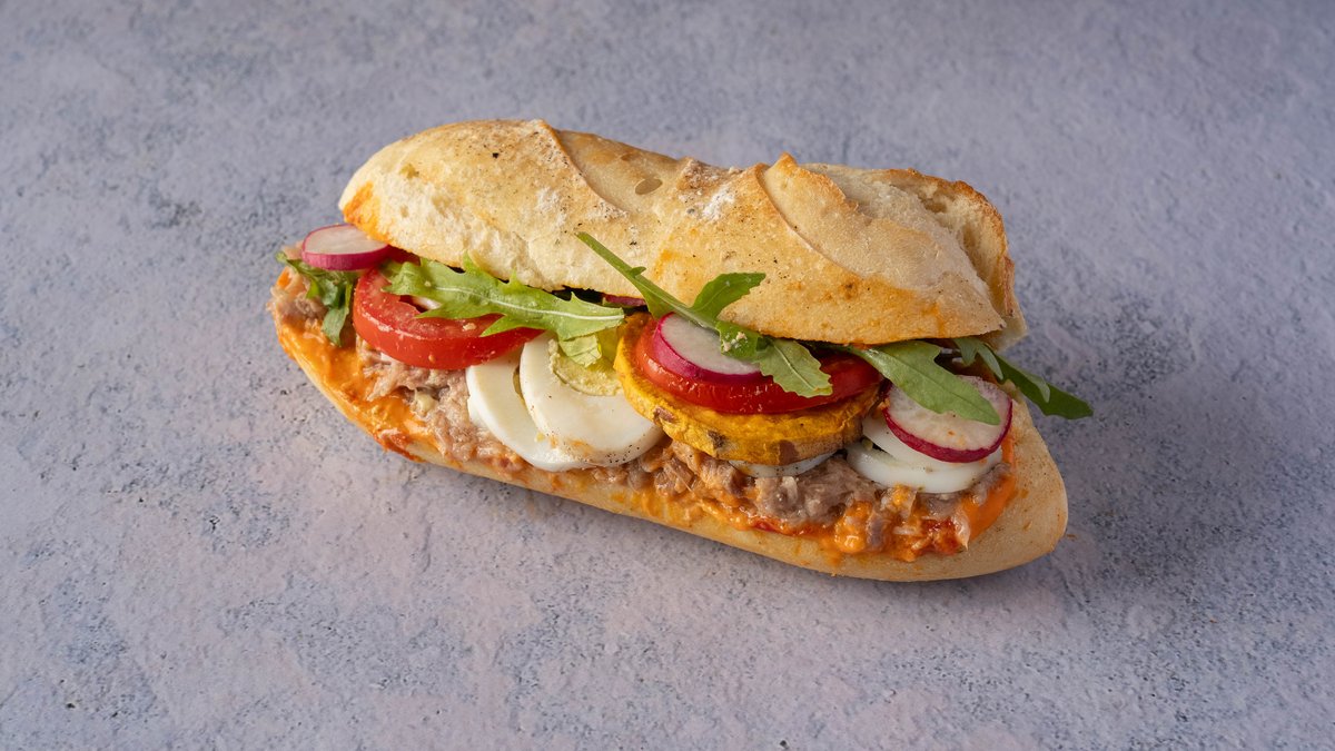 קרם פלפלים, טונה, ביצה קשה, עלי בייבי, עגבנייה, מלפפון חמוץ, רוטב הבית ומלח גס, מוגש עם סלט קטן בצד