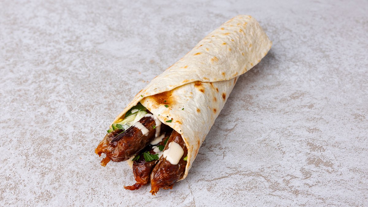 230 גרם בורגר עסיסי בלחמנייה טרייה, עם רוטב הבית, חסה, חמוצים, בצל ועגבנייה. מעל הבורגר: נקניקיות מרגז חריפות.