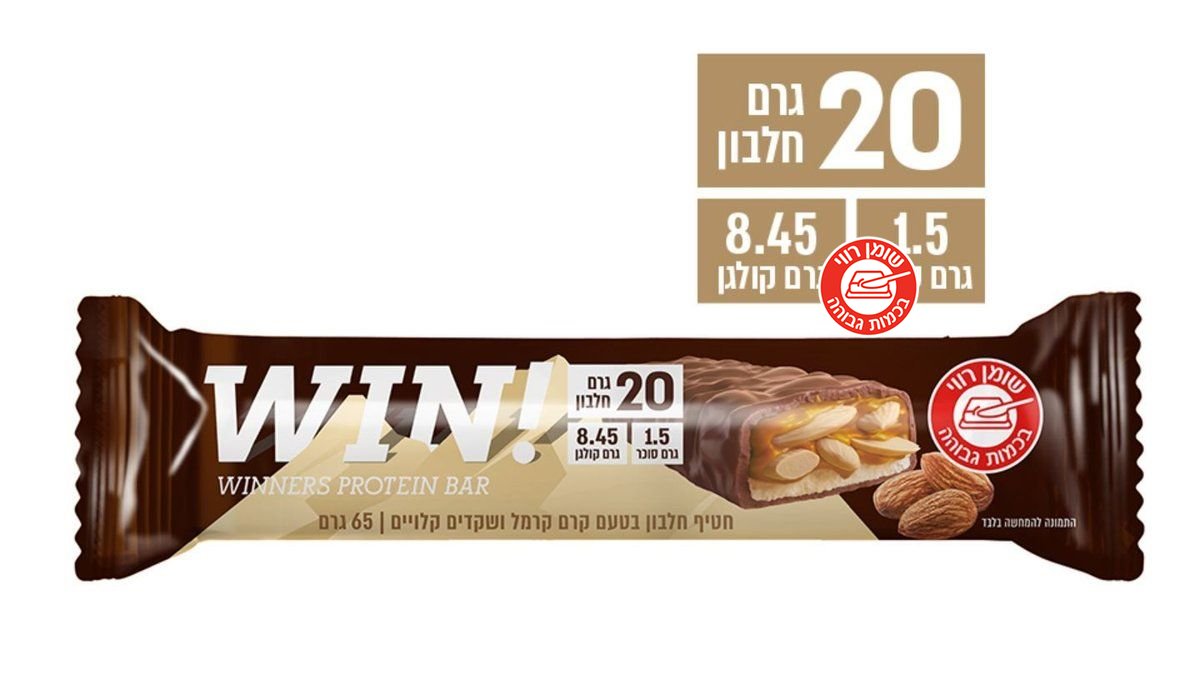 WIN חטיף חלבון קראנצ׳ בטעם קרמל מלוח בציפוי שוקולד חלב מעולה 64 גרם