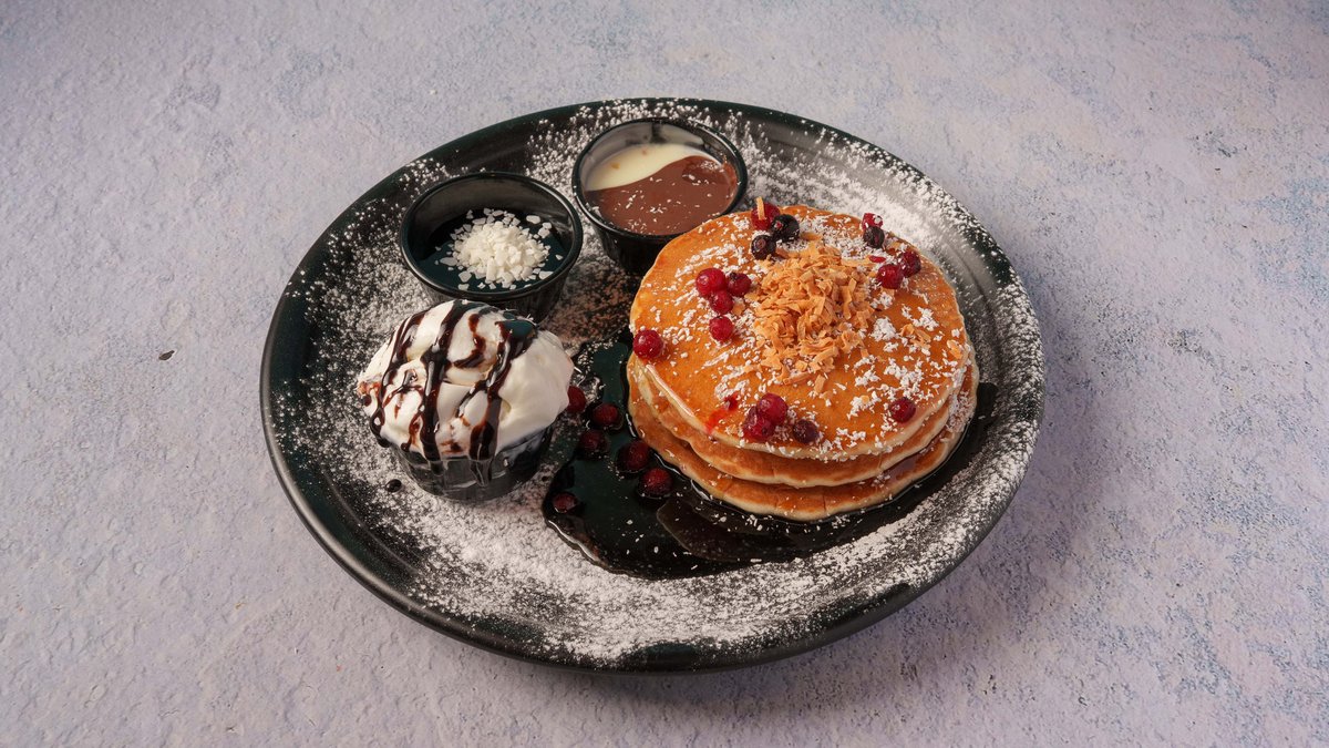 16 כדורי פנקייק עם רוטב פיסטוק ושיעורת כנאפה, מוגש עם כדור גלידה 16 كرة بانكيك مع صلصة الفستق وشعار الكنافة، تُقدم مع كرة من البوظة