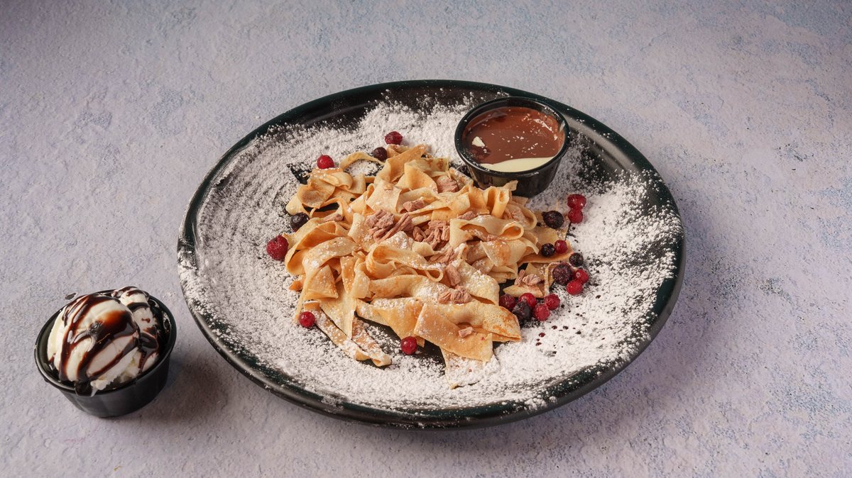 קרפ במילוי סירופ פיסטוק ושערות קדאיף, מוגש עם גלידה לבחירה كريب محشو بشراب فستق و شعر كنافة، يقدم مع بوظة حسب الإختيار