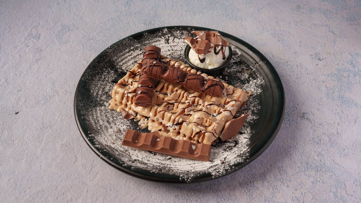 ופל עם סירופ קינדר וקינדר, מוגש עם כדור גלידה وافل مع صوص كيندر وكيندر،يقدم مع كرة من البوظة