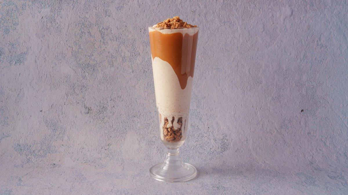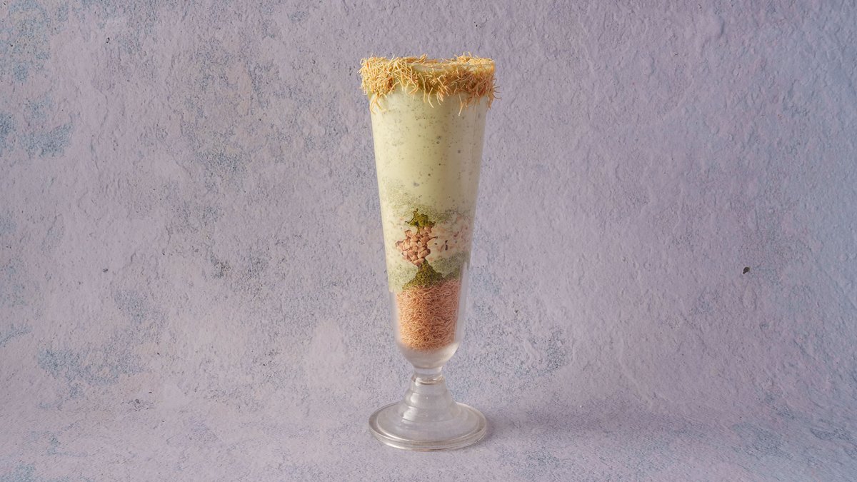 מילקשייק מגלידת פיסטוק עם תערובת דובאי (פיסטוק ושערות קדאיף) בטעם שוקולד בלגי ميلكشيك من بوظة الفستق مع خليط دبي (فستق وشعر الكنافة) بنكهة الشوكولاتة البلجيكية الفاخرة. יוקרתי