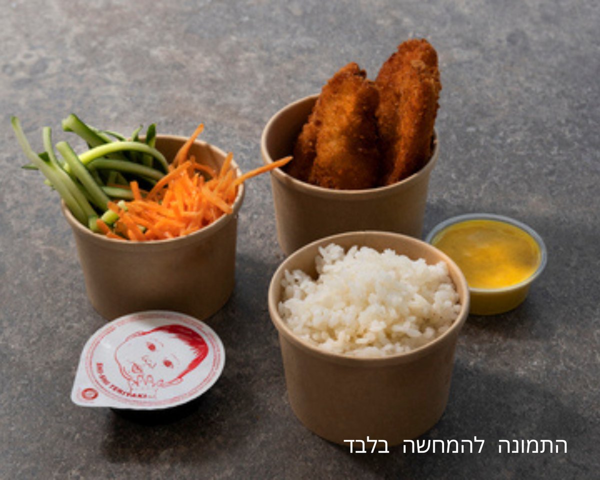 אצבעות שניצל פריך מחזה עוף טרי על אורז, עם רטבים לבחירה