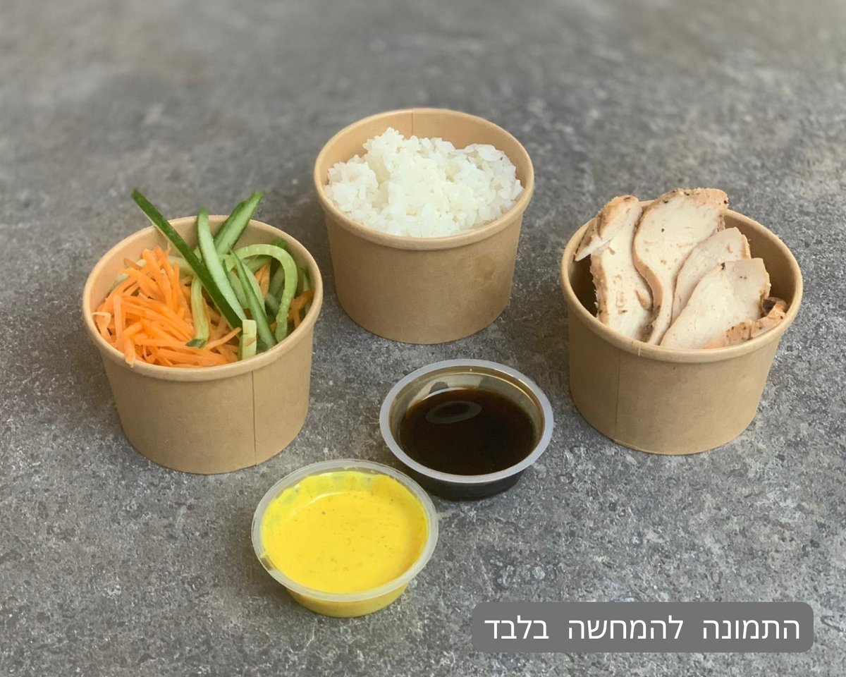 קערת אורז מאודה עם גזר ומלפפון חתוכים דק ותוספת לבחירה. כל אחד בקופסה נפרדת כמו שילדים אוהבים ולא לשכוח לבחור רוטב. התמונה להמחשה בלבד – מחיר המנה נקבע לפי מרכיבי המנה. המרכיבים אינם מכילים גלוטן, אולם המטבח שלנו אינו סביבה סטרילית.