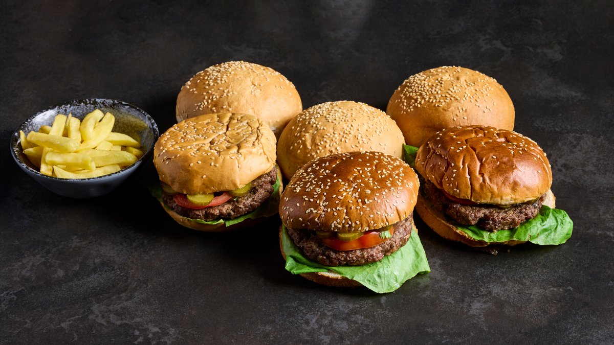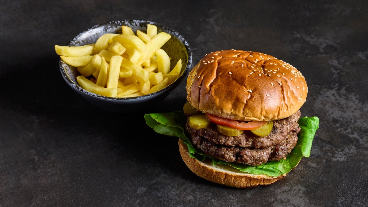 המבורגר בקר 270 גרם מוגש עם צ׳יפס