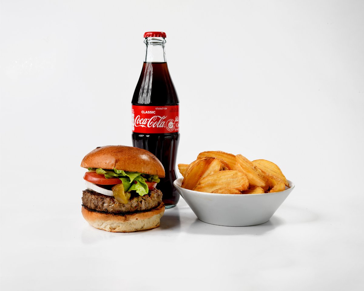 המבורגר לבחירה. חסה, עגבנייה, בצל ומלפפון חמוץ. תוספת ושתייה