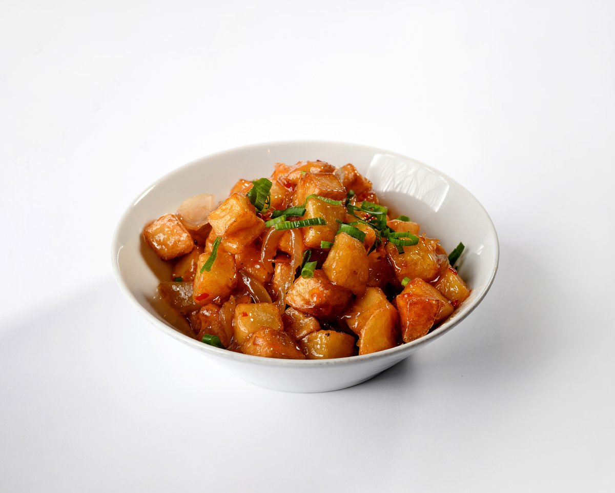 קבויות תפו"א מטוגנות עם רצועות בצל דקיקות ברוטב צ'ילי, מעוטרות בטבעות בצל ירוק